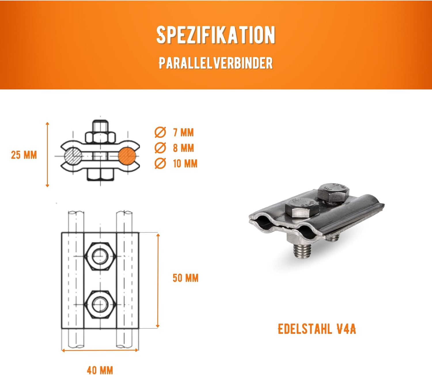 Es besteht aus säurebeständigem V4A-Stahl und gewährleistet eine lange Lebensdauer und hohe Korrosionsbeständigkeit. Es ist ein unverzichtbares Element professioneller Blitzschutzsysteme, bei denen Qualität, Verbindungssicherheit und die Einhaltung von Branchenstandards zählen.