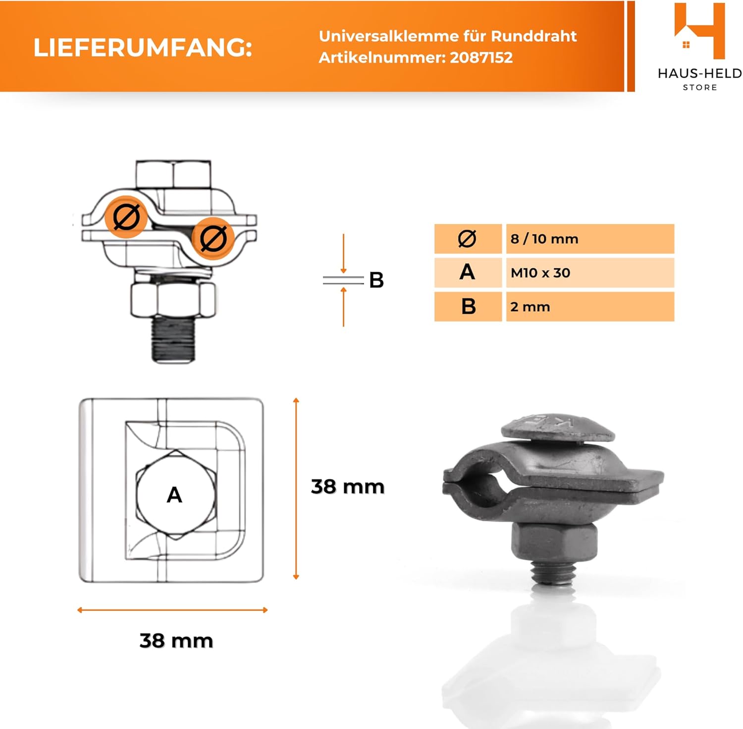 Die Klemme ist aus hochwertigem feuerverzinktem Stahl gefertigt, was Korrosionsbeständigkeit, Witterungsbeständigkeit und einen langjährigen Einsatz im Außenbereich und in industriellen Umgebungen garantiert. Sie ist für Elektriker, Installationsfirmen und Auftragnehmer bestimmt, die professionelle LPS-Installationen durchführen.