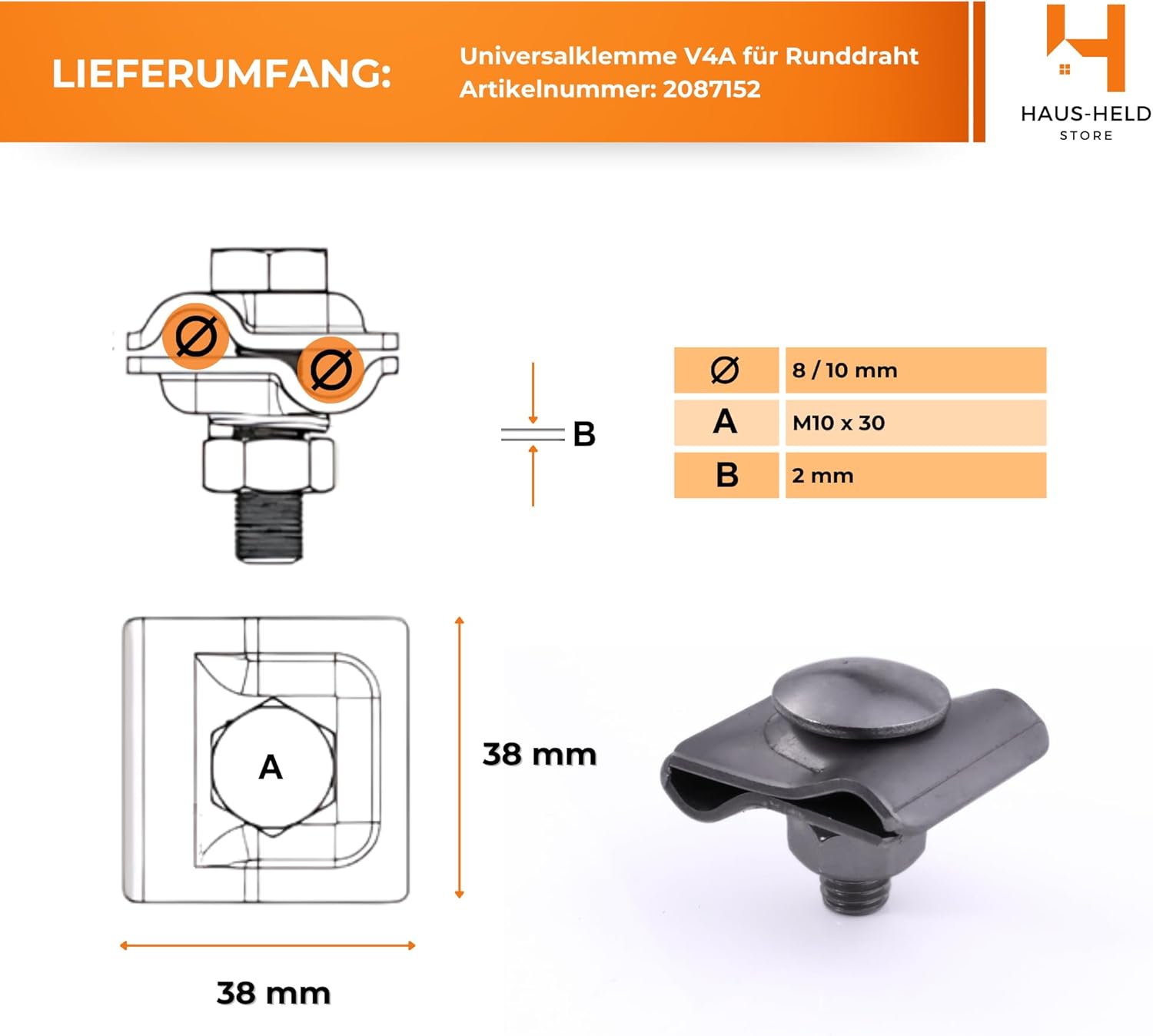 Die Klemme besteht aus hochwertigem V4A-Edelstahl, was maximale Korrosionsbeständigkeit, Witterungsbeständigkeit sowie einen langlebigen Einsatz unter Außen- und Industriebedingungen garantiert. Sie ist für Elektriker, Installationsfirmen und Auftragnehmer bestimmt, die professionelle LPS-Anlagen realisieren.