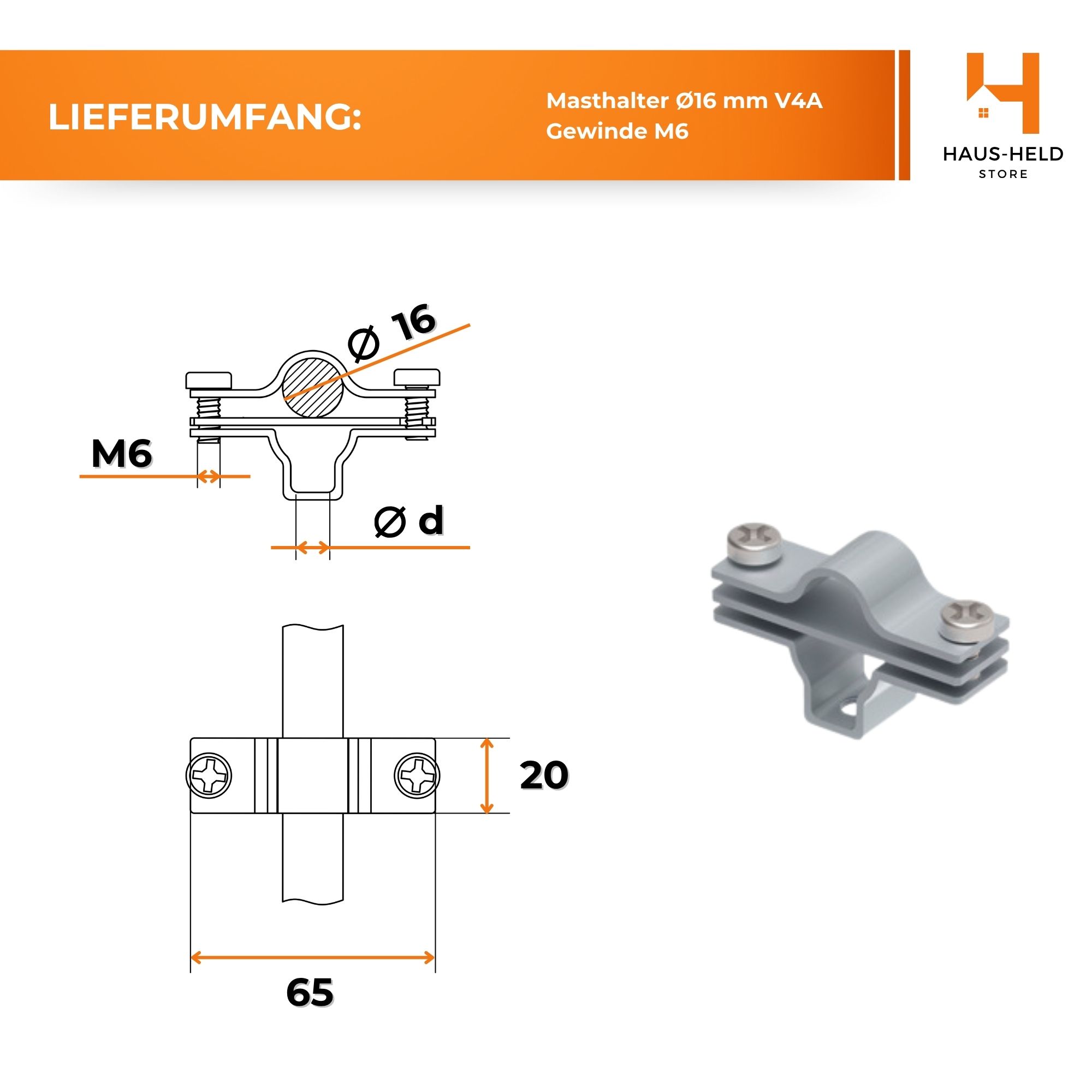 Die Halterung ist kompatibel mit Blitzableitermasten Ø16 mm sowie mit Komponenten von Blitzschutzsystemen wie Mastfüßen, Ableitungen und Erdungselementen und ermöglicht so den Aufbau einer kompletten Anlage.
