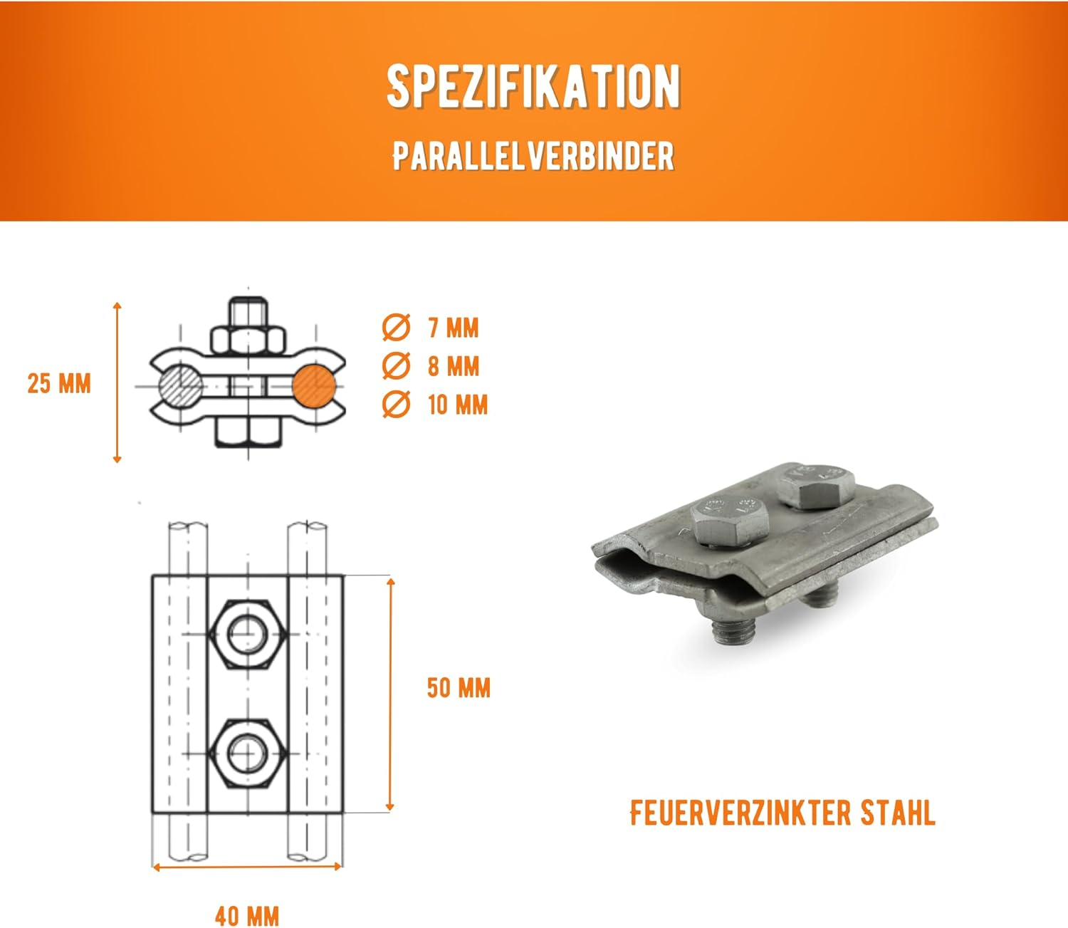 Es dient zur parallelen Verbindung von Runddrähten mit einem Durchmesser von 8-10 mm und gewährleistet mechanische Stabilität sowie vollständige Konformität mit den Anforderungen von Schutzsystemen gegen Stromschläge, Überspannungen und Blitzschlag.