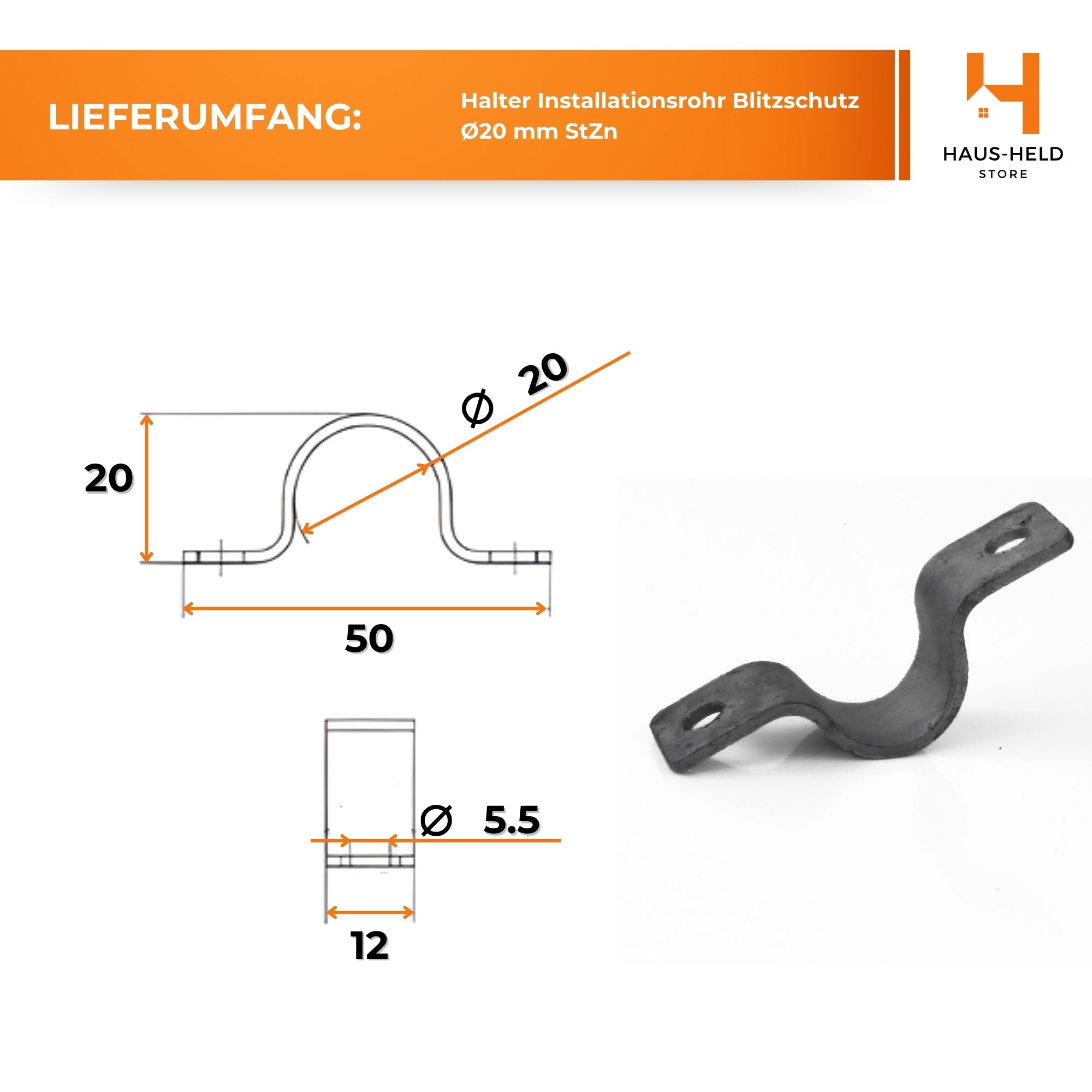 Die Halterung ist für Installationsrohre mit Ø 20 mm vorgesehen. Sie ist kompatibel mit Elementen des Leitungsführungssystems wie Installationsrohren, geraden Verbindungsstücken und Winkelverbindungsstücken und ermöglicht so den Aufbau eines kompletten Blitzschutzsystems.