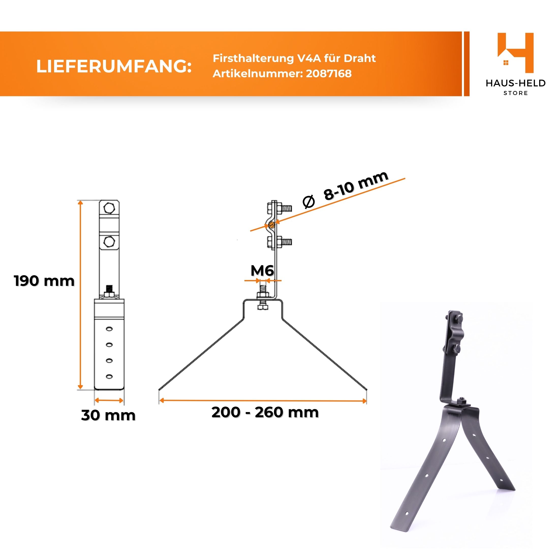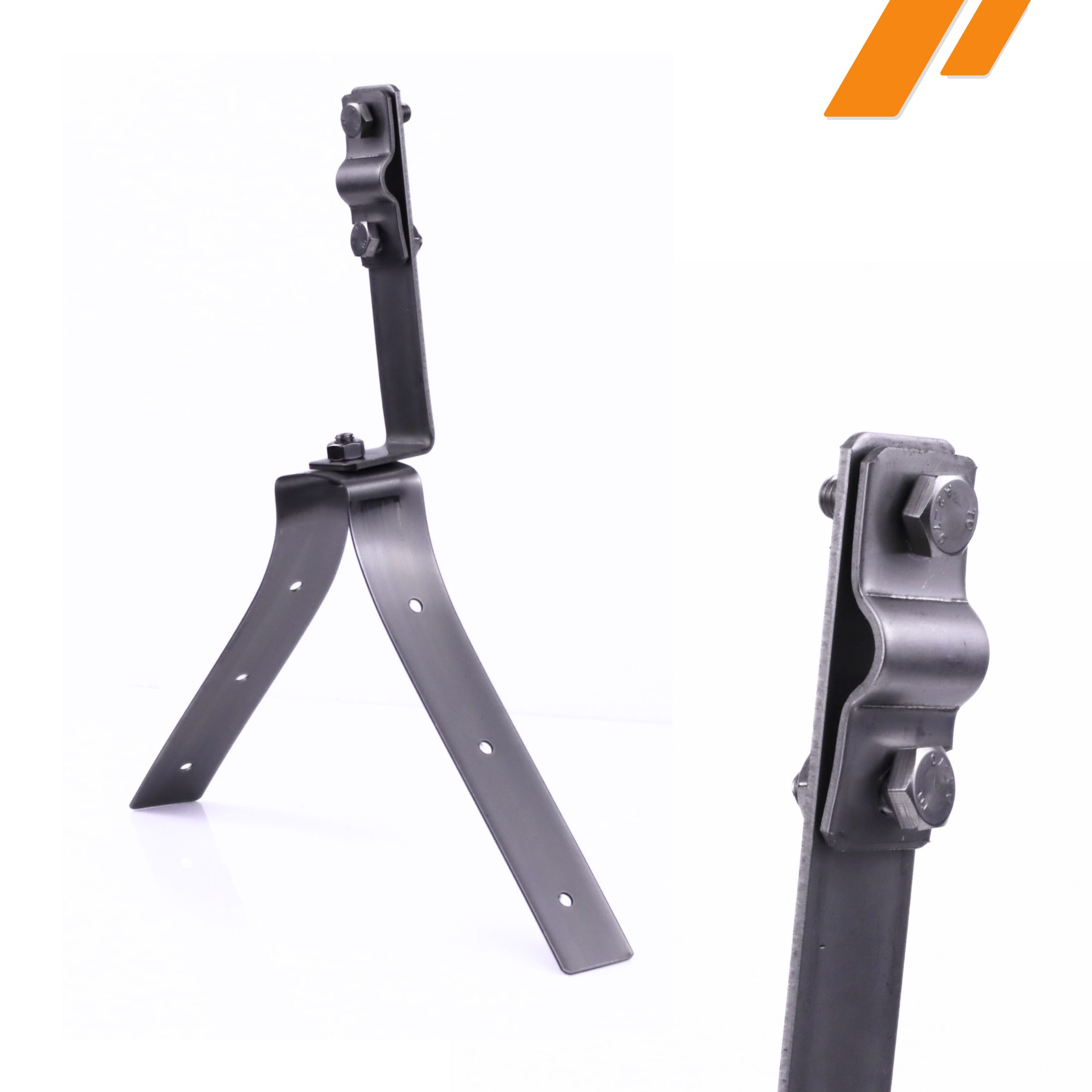 Professionelle Firsthalterung der Marke für die Montage von Blitzschutzanlagen auf Dächern mit Blechdeckung (Trapezblech, Wellblech, Blechdachziegel). Dient zur stabilen Führung und Befestigung von Blitzableitern mit einem Durchmesser von Ø 8-10 mm auf dem First. Dank der Verstellbarkeit im Bereich von 200-260 mm passt sich das Produkt ideal an den Neigungswinkel des Daches und das Profil des Blechs an.