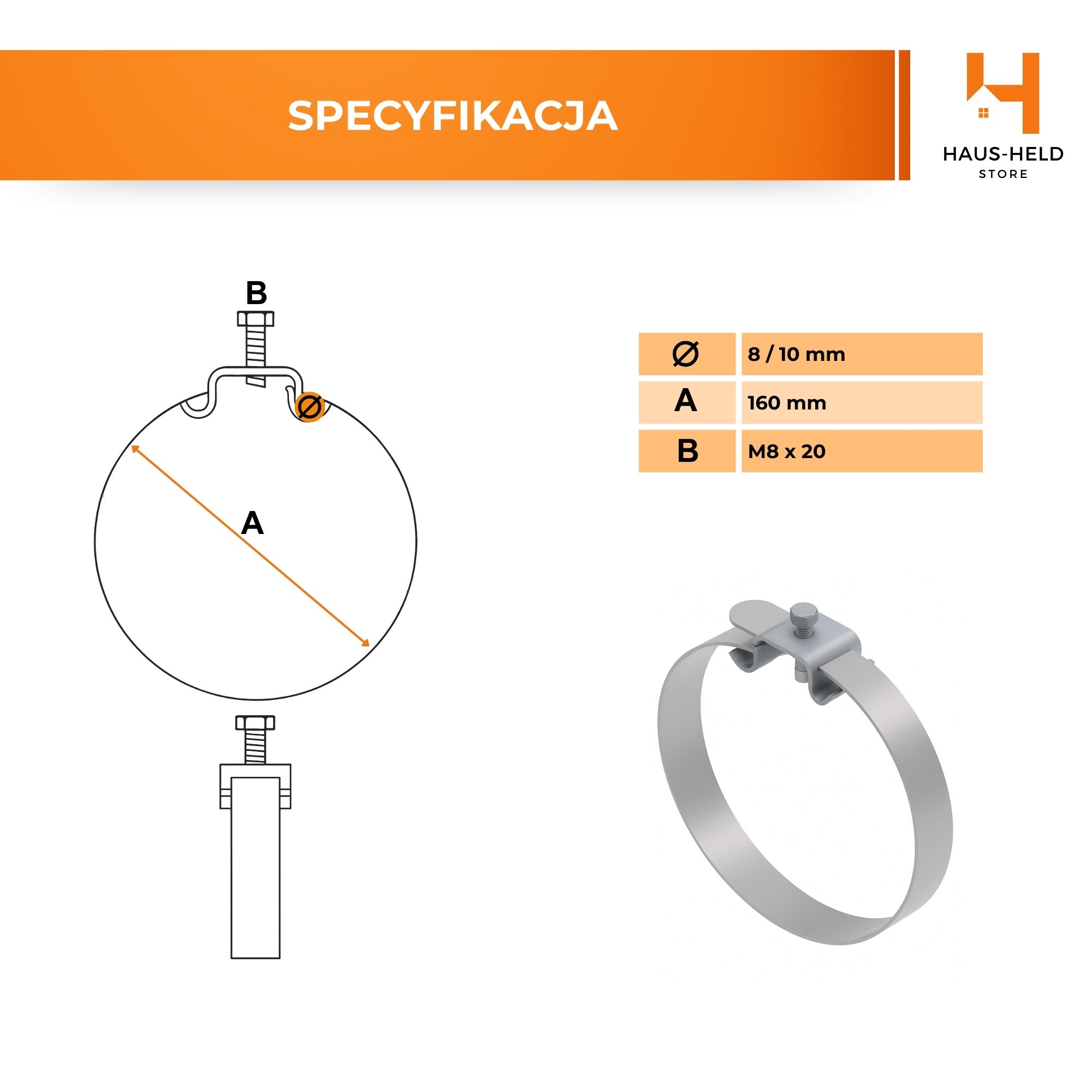 Obejma wykonana jest z wysokiej jakości stali nierdzewnej, dzięki czemu cechuje się pełną odpornością na korozję, warunki atmosferyczne oraz wieloletnią eksploatację na zewnątrz budynku. Regulowana szerokość pozwala na montaż na rurach spustowych o średnicy do 160 mm, bez konieczności wiercenia w rurze. Zapewnia to estetyczne, bezpieczne i trwałe prowadzenie przewodu odgromowego wzdłuż elewacji.
